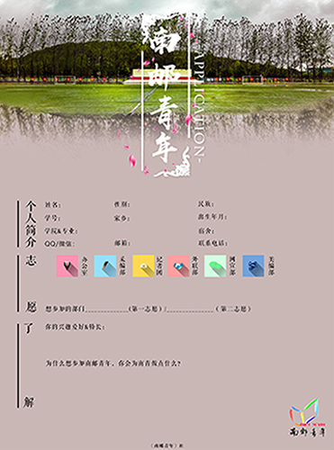 《南邮青年》社现设有五个部门:细微后勤、活力统筹的办公室;捕光逐影、精通采访的记者团;妙笔生花、意趣横生的采编部;南青门户——网宣部;一键美“颜”的美编部。在《南邮青年》社,你不仅可以放飞文字梦想、展现文艺文采,还可以在这里收获无与伦比的乐趣与友谊。